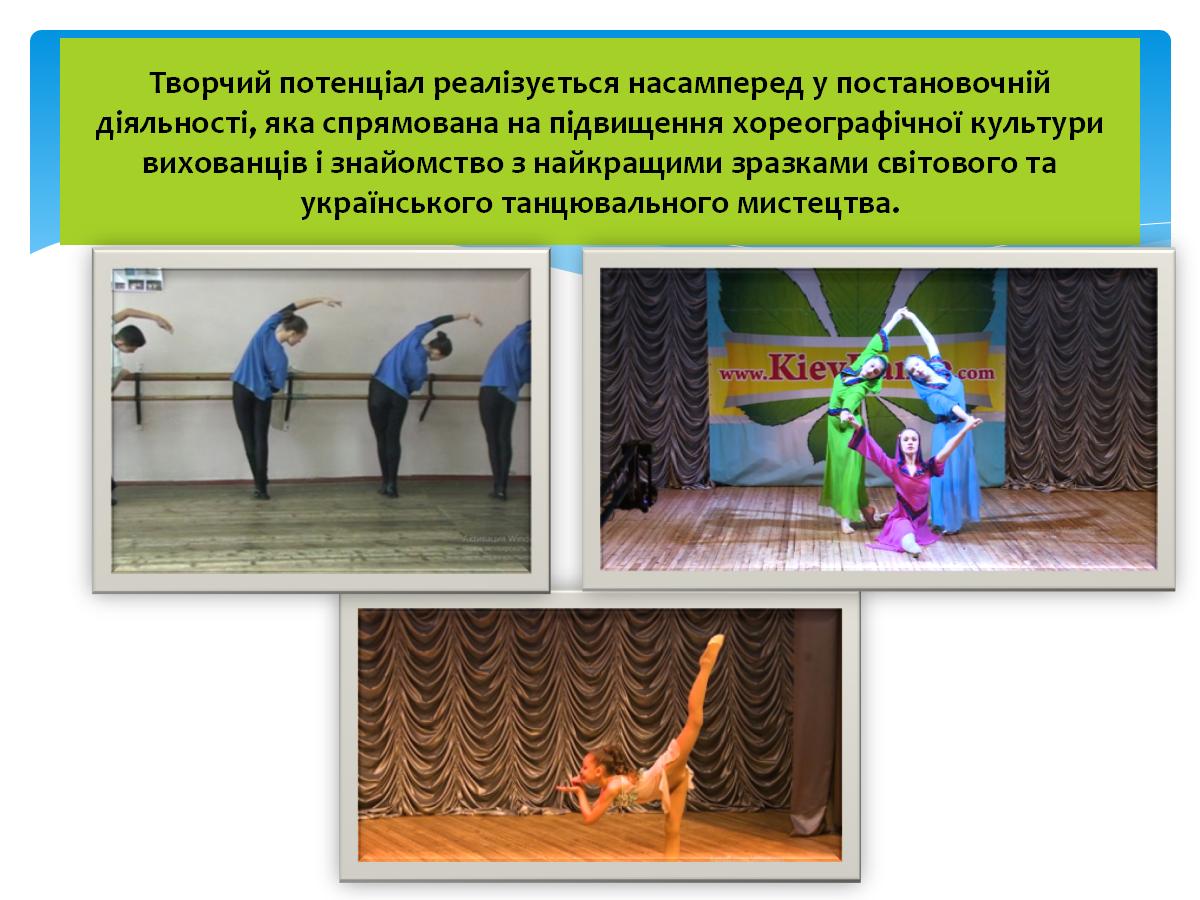 Творчий потенціал реалізується насамперед у постановочній діяльності, яка спрямована на підвищення хореографічної культури вихованців і знайомство з найкращими зразками світового та українського танцювального мистецтва.