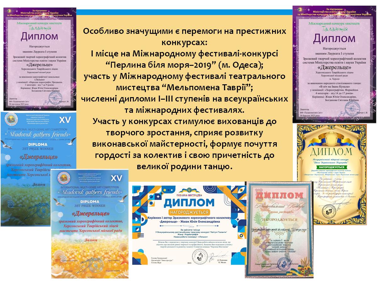 численні дипломи І–ІІІ ступенів на всеукраїнських та міжнародних фестивалях.