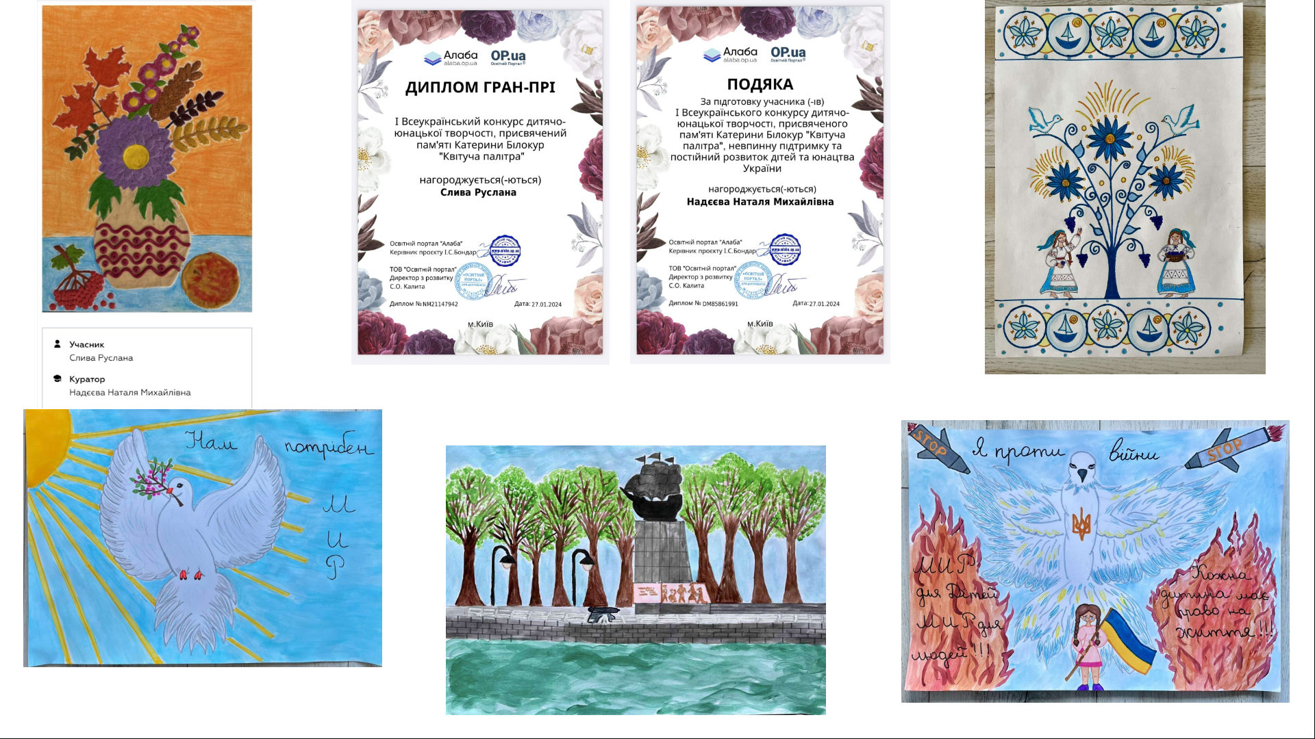 Руслана Слива маленька, але дуже талановита художниця, її творчий поступ, мистецький розвиток спрямовує і невпинно підтримує Наталя Надєєва, вчитель образотворчого мистецтва Херсонського Таврійського ліцею.