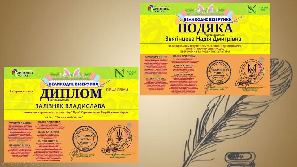 Щирі вітання талановитій учениці Залізняк Владиславі з Дипломом Першої Премії у II Всеукраїнському багатожанровому конкурсі мистецтв "Великодні візерунки" у жанрі авторська проза за чуттєвий та оригінальний твір "Таємна майстерня"!