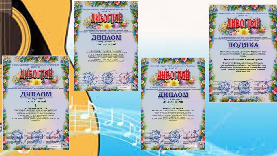 Вітаємо солістів-гітаристів — Мелешка В., Іваницького А. та ансамбль гітаристів "Maestro" із блискучою перемогою на III Міжнародному двотуровому фестивалі-конкурсі мистецтв "Дивограй"!
