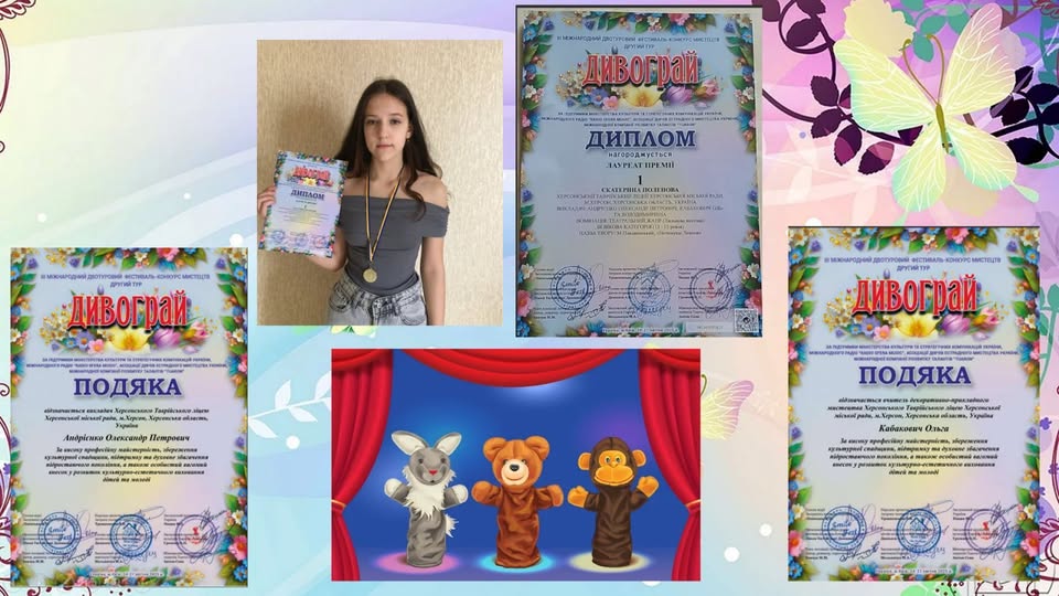 Щирі вітання нашій обдарованій учениці Єкатерині Поленовій з отриманням Диплома Лауреата І Премії у III Міжнародному двотуровому фестивалі-конкурсі мистецтв "Дивограй" у номінації «Театральний жанр (лялькова вистава)»!
