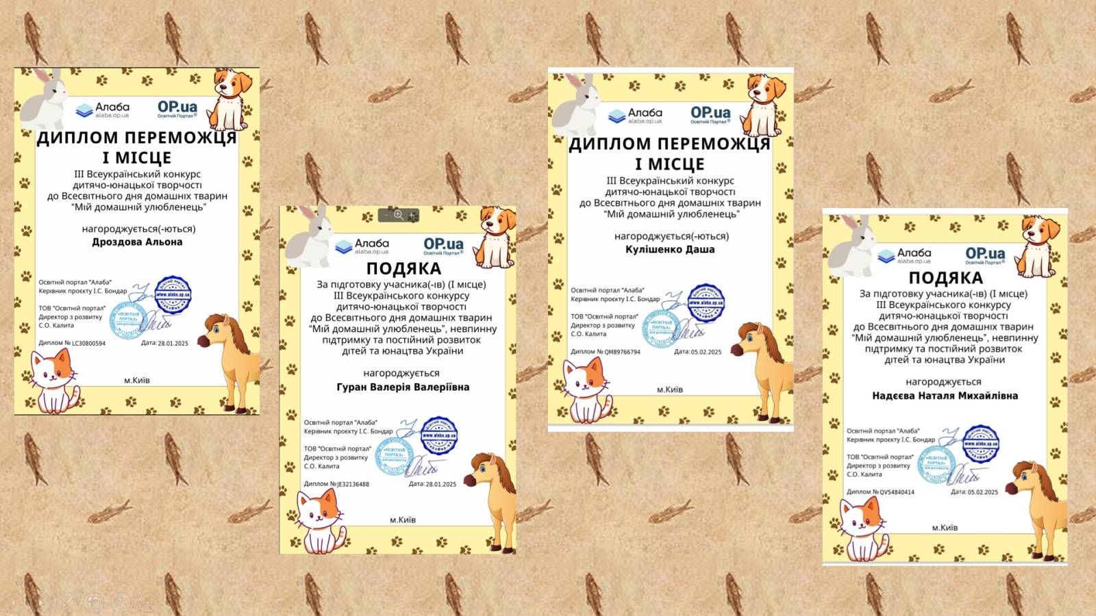 Вітаємо Дроздову Альону та Кулішенко Дар'ю з Дипломами Переможців I місце у III Всеукраїнському конкурсі дитячо- юнацької творчості "Мій домашній улюбленець".