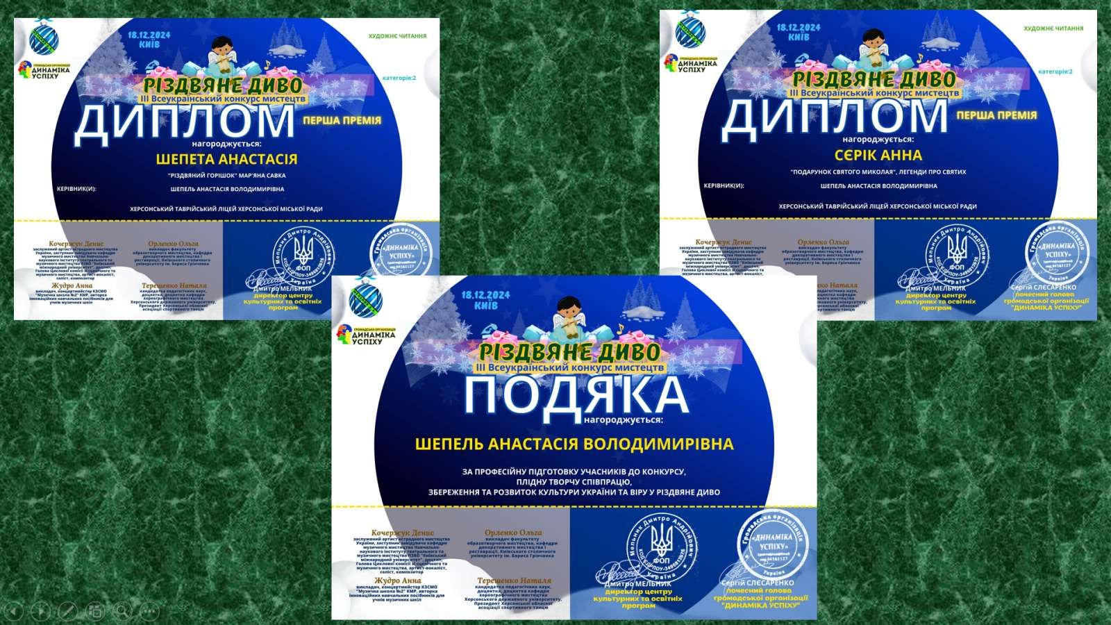 Вітаємо вихованців театру юного глядача "Арт- ліцей": Шепету Анастасію, Сєрік Анну та Шепель Анастасію Володимирівну зі здобутям Дипломів Перших Премій у III Всеукраїнському конкурсі мистецтв " Різдвяне диво". Ви довели, що наполегливість, талант і любов до мистецтва творять справжні дива. Ваші яскраві образи, майстерність і щирість на сцені не залишили байдужими нікого.
