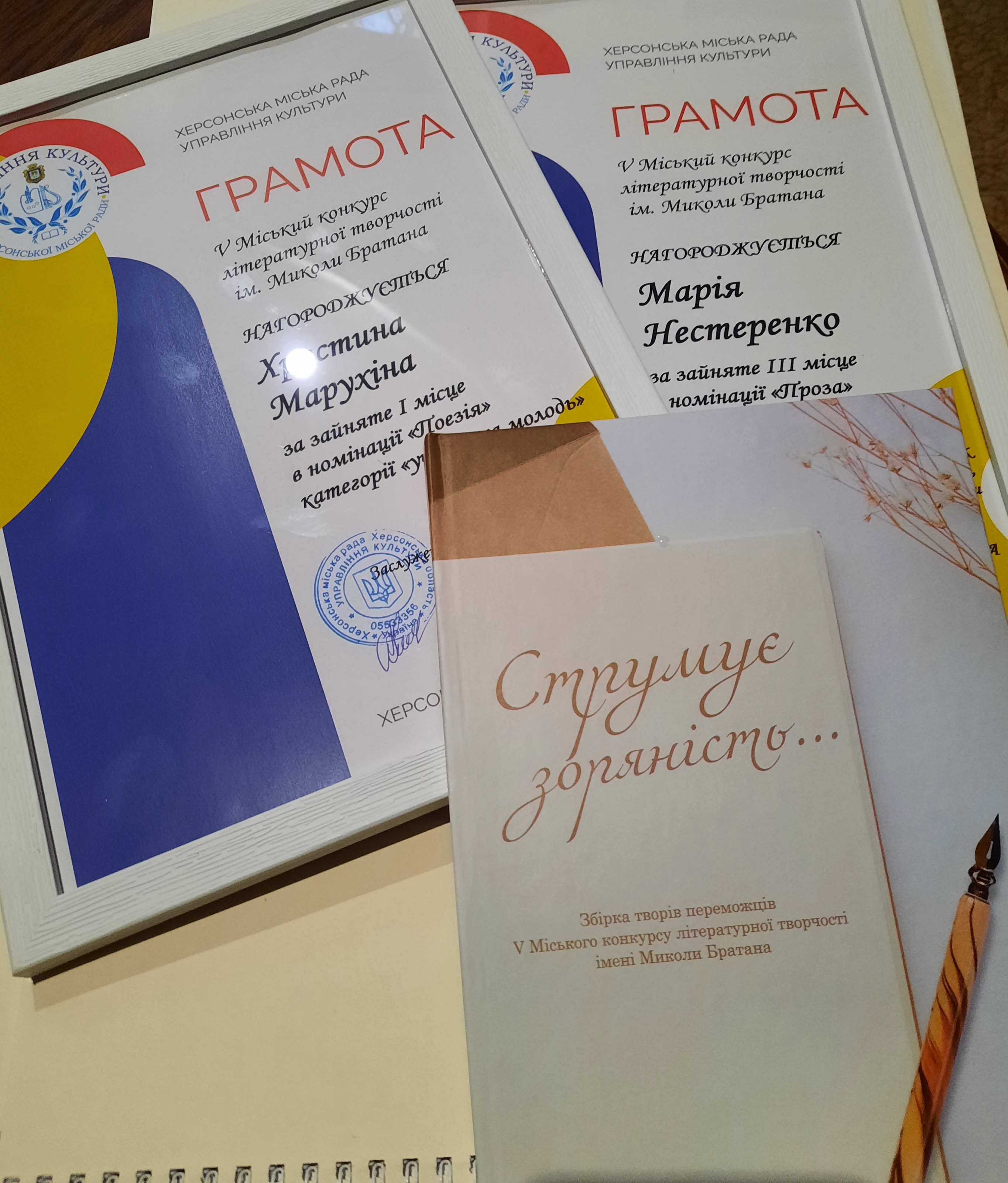 Трохи раніше за підсумки V-го відкритого літературного конкурсу ім. Миколи Братана, що поводиться в нашому місті раз на 2 роки, у номінації «Поезія учнівської молоді» переможницею стала Христина Марухіна, 7-мт. У номінації «Проза учнівської молоді» 3 місце посіла Марія Нестеренко. Дівчата стали співавторками гарного паперового видання - колективної збірки «Струменіє зоряність». Доречно нагадати, що Марія стає призеркою цього конкурсу вже вдруге.