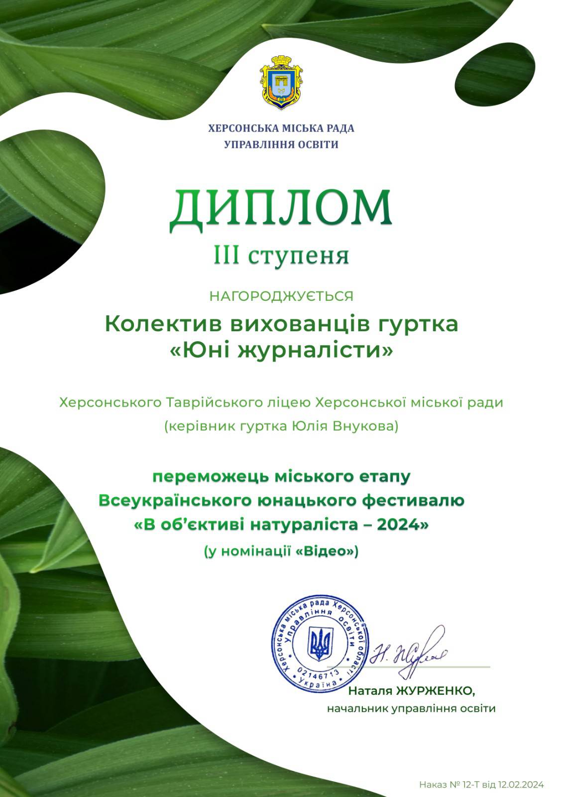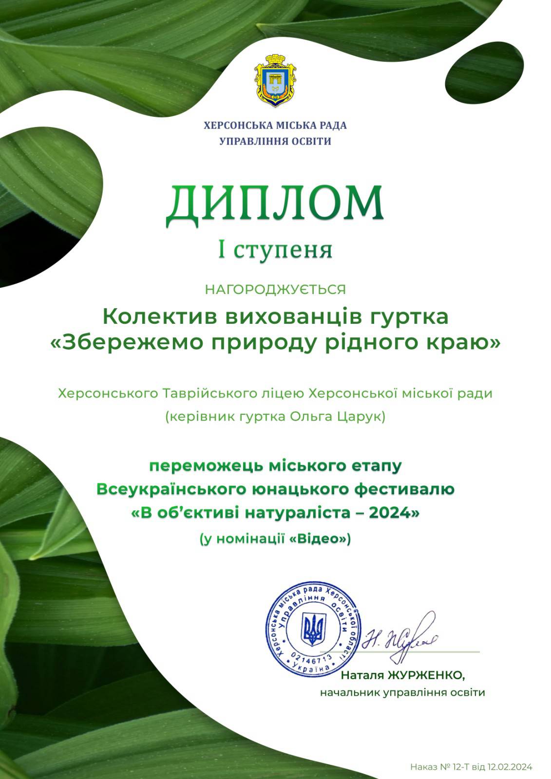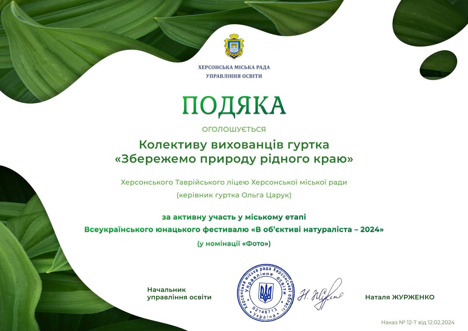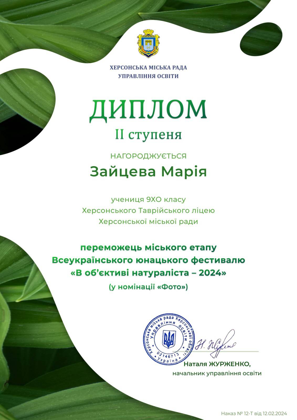 Вітаємо колективи вихованців гуртків «Збережемо природу рідного краю» та "Юні журналісти", а також ученицю 3-ХТ класу Діану ТОГУШЕВУ та ученицю 9-ХО класу Марію ЗАЙЦЕВУ, які здобули перемогу в міському етапі Всеукраїнського юнацького фестивалю «В об’єктиві натураліста – 2024».