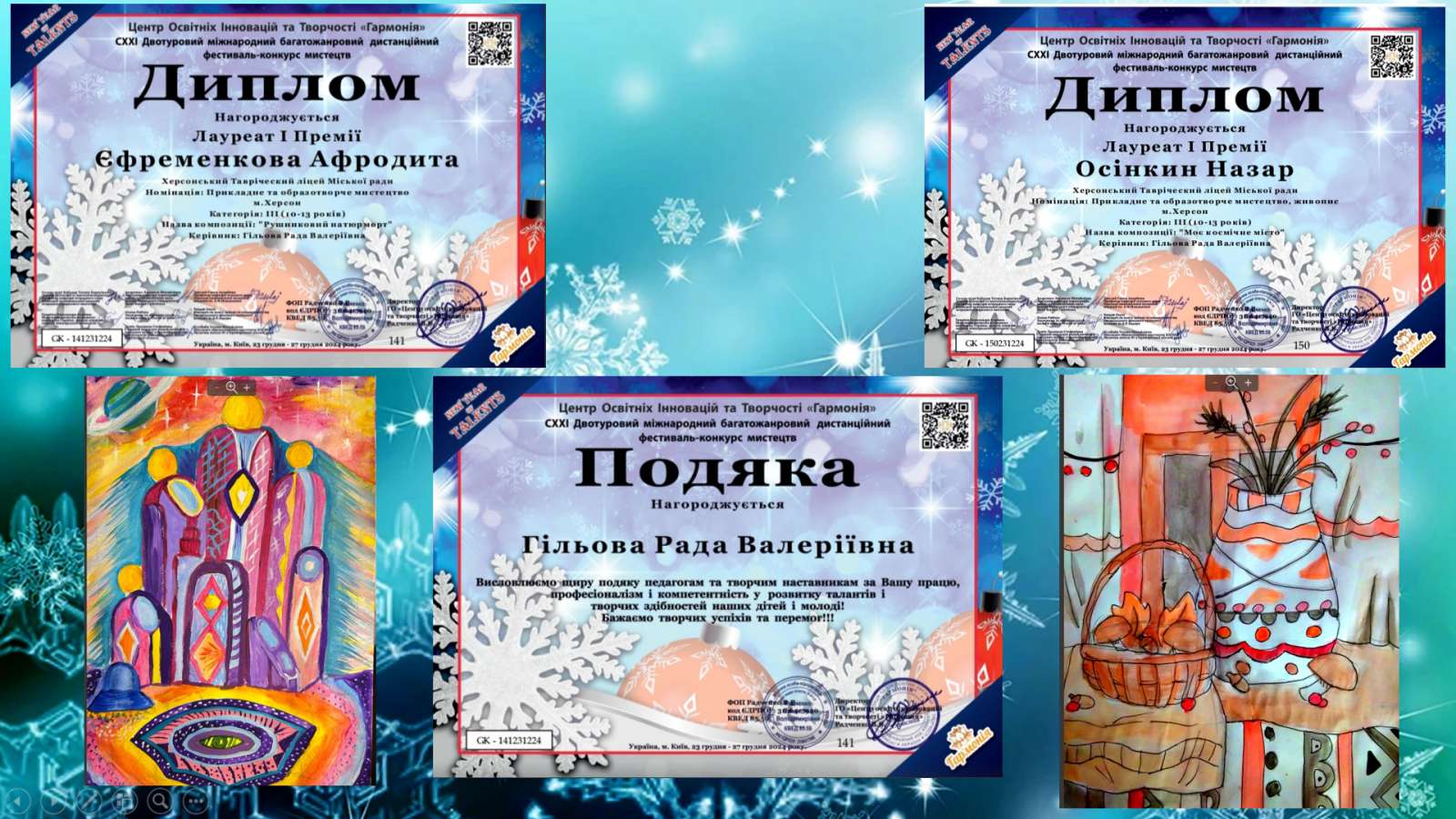 Раді презентувати Вам нагороди наших учнів: Осинкіна Назара та Єфременкової Афродіти у Міжнародному багатожанровому дистанційному фестивалі- конкурсі мистецтв " New Year and Talents".