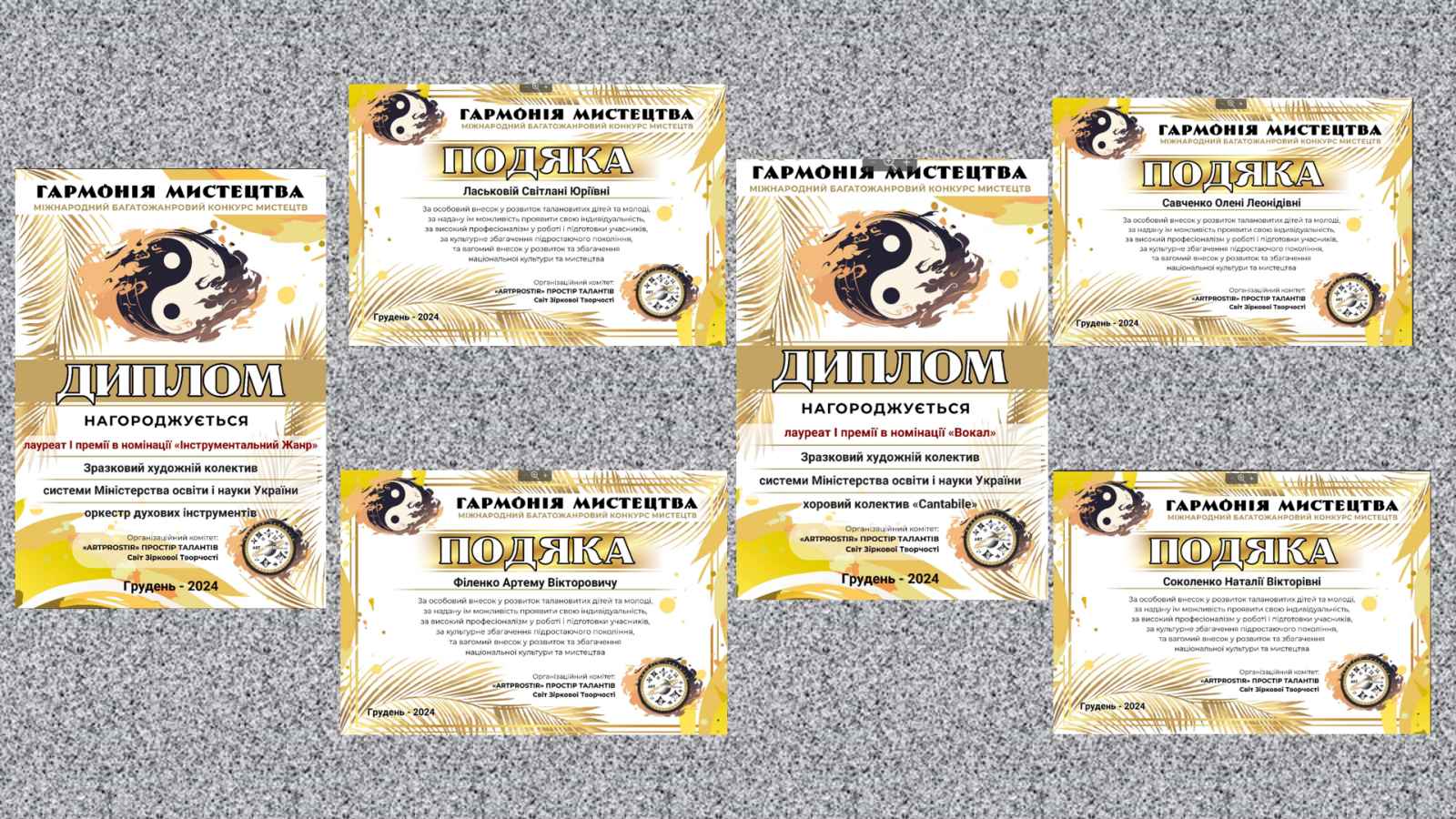Сьогодні свої досягнення, а саме Дипломи Лауреатів I Премій, у Міжнародному багатожанровому конкурсі мистецтв " Гармонія мистецтва" призентують нам Зразкові художні колективи системи Міністерства освіти і науки України оркестр духових інструментів та хоровий колектив " Contabile".