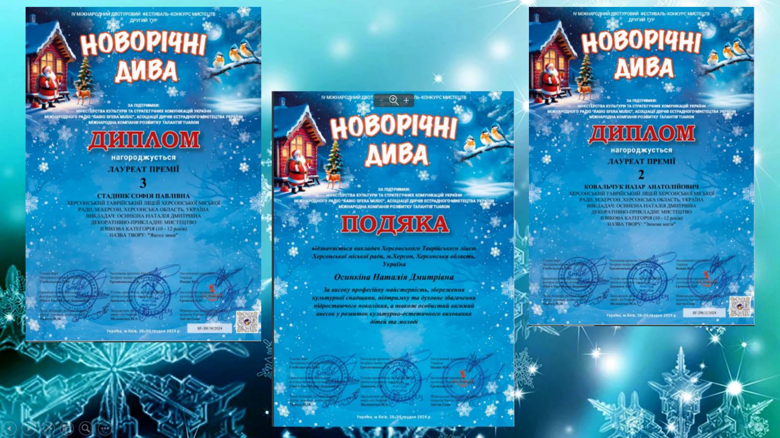 Сьогодні вітаємо Стадник Софію та Ковальчука Назара із заслуженими нагородами у Міжнародному фестивалі-конкурсі мистецтв "Новорічні дива", жанрі декоративно-прикладного мистецтва! Подякою відзначена їх наставник- Осинкіна Н.Д.! Ваша творчість, майстерність і наполеглива праця принесли чудові результати. Ви не тільки зберігаєте та примножуєте традиції мистецтва, а й надихаєте інших своїм талантом.
