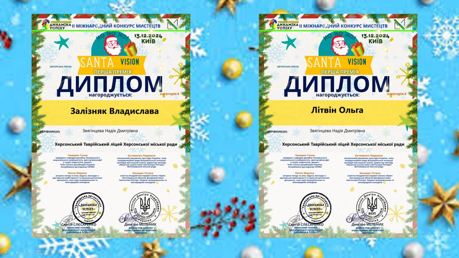 І знову наші юні майстрині слова: Залізняк Владислава та Літвін Ольга здобувають Дипломи Перших Премій у Міжнародному конкурсі мистецтв " Santa Vision"! Ви вміло творите магію тексту, передаючи емоції, думки та ідеї, що залишають глибокий слід у серцях читачів.