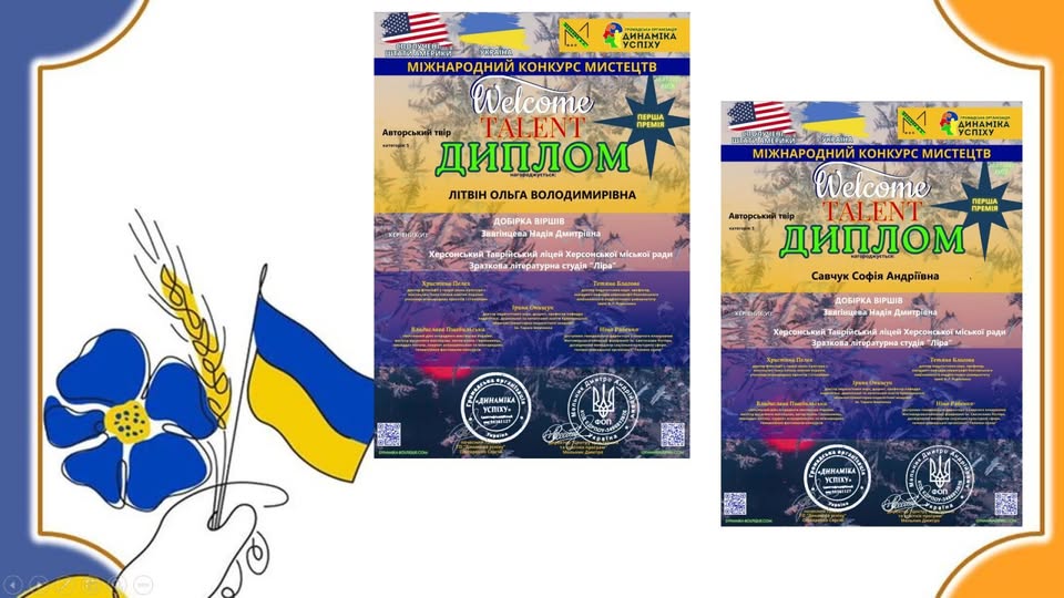 Вітаємо вихованиць зразкової літературної студії "Ліра": Літвін Ольгу та Савчук Софію зі здобуттям Дипломів Перших Премій у Міжнародному конкурсі мистецтв "Welcome Talent"! Жюрі надало високу оцінку авторським добіркам віршів дівчаток. Натхнення Вам на нові творчі пошуки та скоріших нових перемог!