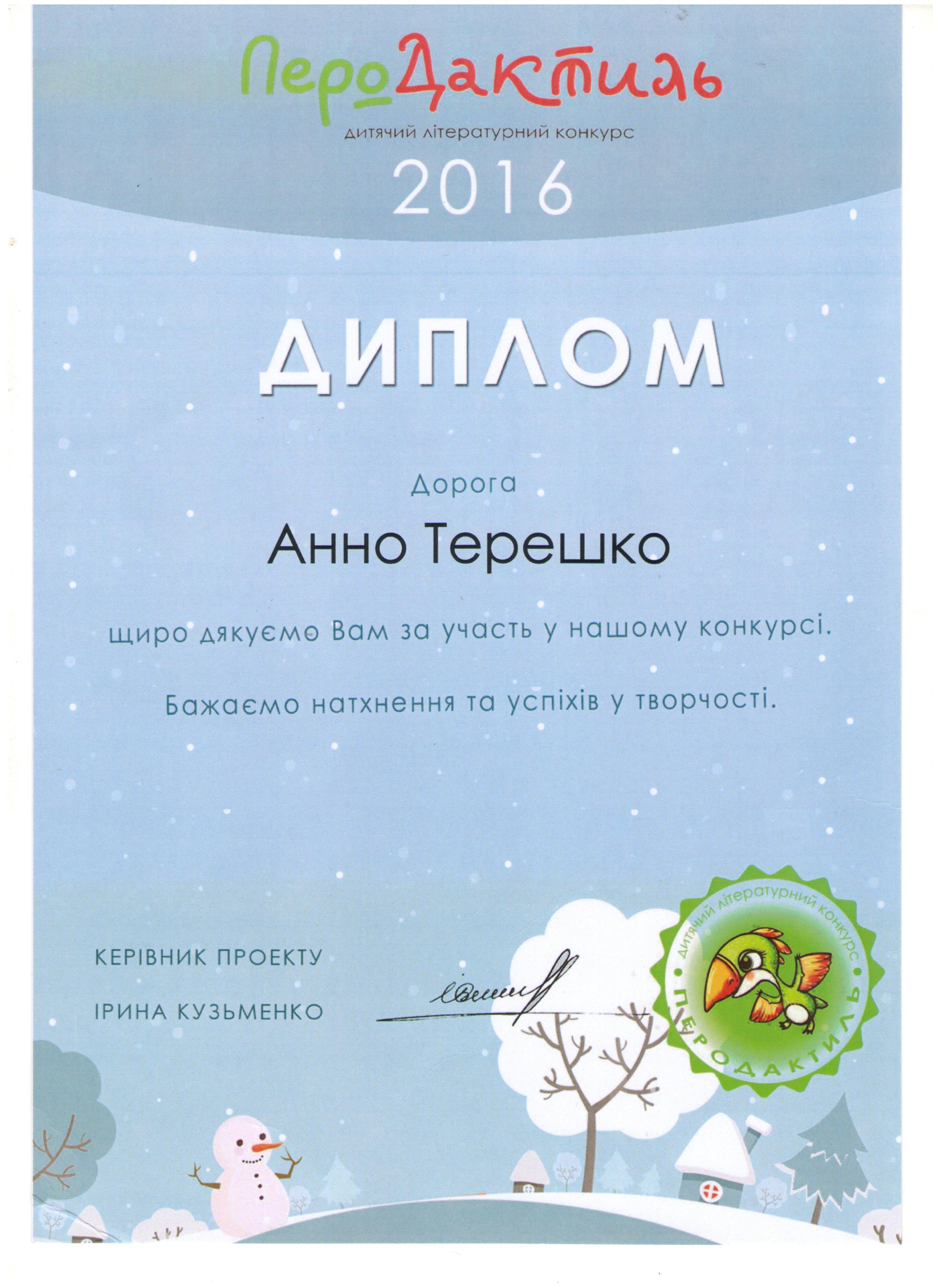 Вітаємо дипломантку дитячого літературного конкурсу "ПероДактиль 2016" Терешко Анну, вихованку зразкової літературної студії "Ліра" (кер. Павленко Т.С.). З творами юної поетеси можна ознайомитись перейшовши за посиланням http://www.perodaktyl.com.ua/index.php/poetry-8-10-rokiv/item/87-tereshko-anna