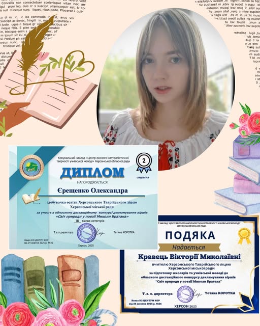 У обласному дистанційному конкурсі декламування віршів «Світ природи у поезії Миколи Братана» наша талановита учениця Олександра Єрещенко, 9-ТО клас, виборола ІІ місце в ІІІ віковій категорії!