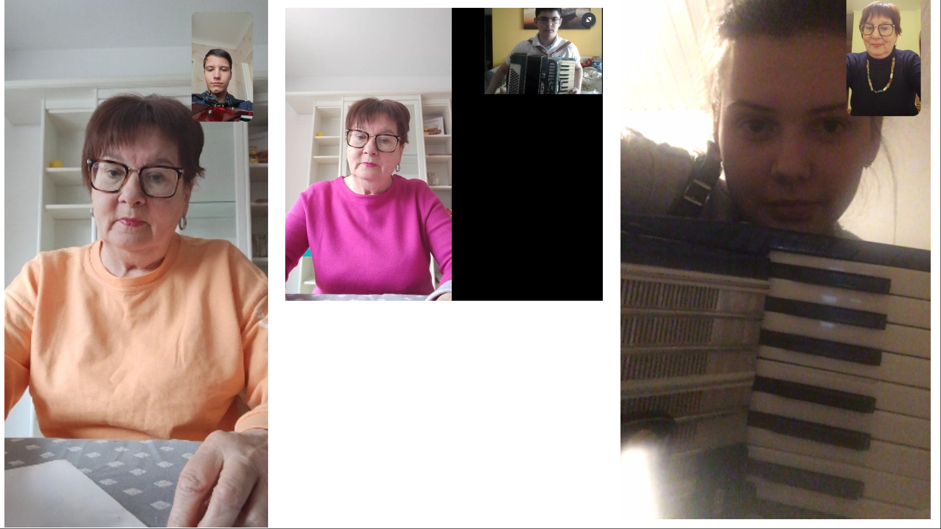 Скріншоти онлайн уроків з музичного інструменту (акордеон) з учнями 9-мт класу Кубатко І., Смирновим А. та ученицею 11-мхто Чепурко З. вчитель Прилуцька О.П. На індивідуальних уроках відпрацьовуємо технічні моменти, торкаємося питань елементарної теорії музики, музичного мистецтва, формуємо музичний смак на зразках творів сучасних українських композиторів. Незважаючи на те, що учні знаходяться у небезпечному Херсоні та за кордоном, вони успішно виконують програмні вимоги, працюють на результат, систематично беруть участь і перемагають у міських, обласних, всеукраїнських та міжнародних фестивалях та конкурсах.