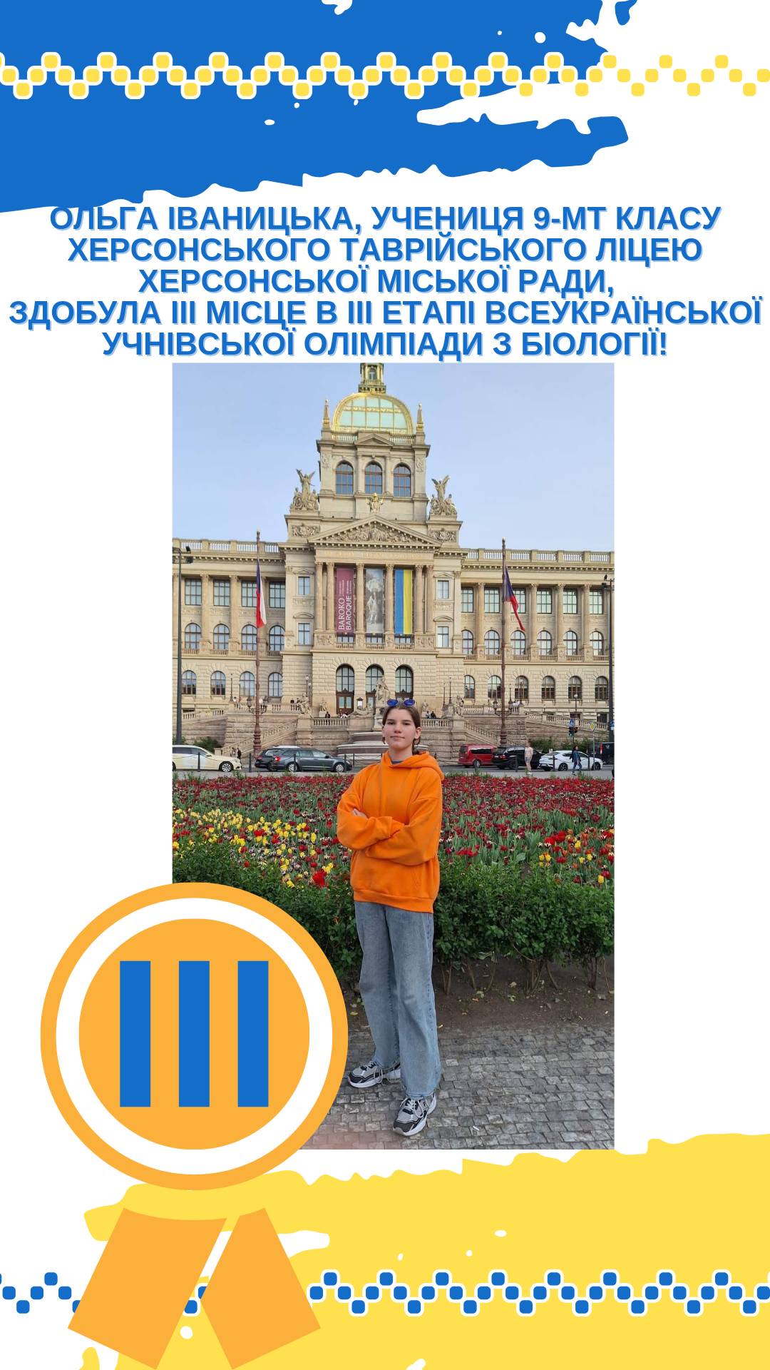 Вітаємо Ольгу ІВАНИЦЬКУ, ученицю 9-МТ класу Херсонського Таврійського ліцею Херсонської міської ради, із здобутим ІІІ місцем у ІІІ етапі Всеукраїнської учнівської олімпіади з біології!