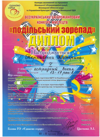 Вітаємо Катерину Тернавську, яка зайняла ІІ місце у Всеукраїнському багатожанровому конкурсі мистецтв! Бажаємо натхнення та творчих успіхів!