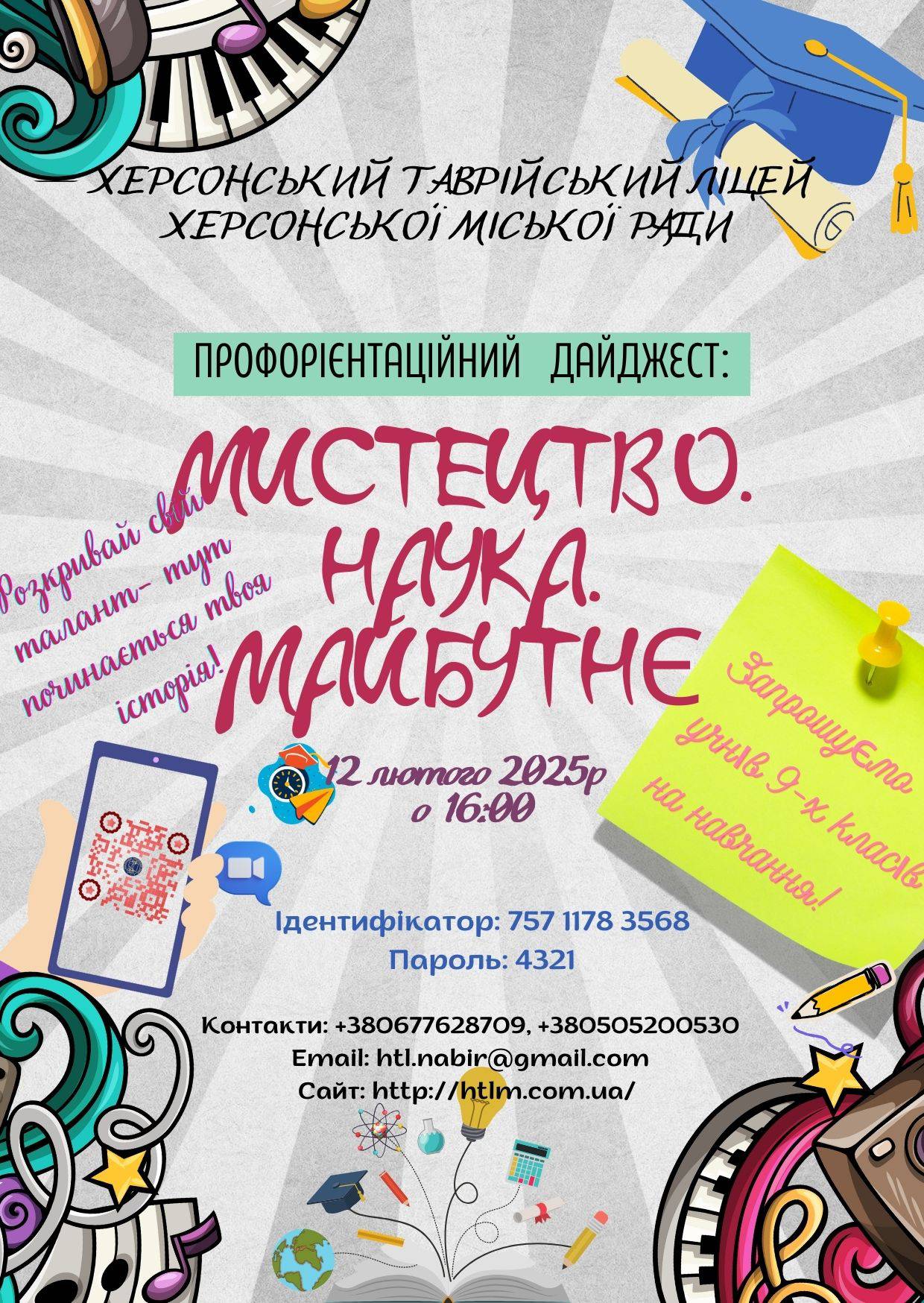 Херсонський Таврійський ліцей запрошує на профорієнтаційний дайджест "МИСТЕЦТВО. НАУКА. МАЙБУТНЄ" для учнів 9-х класів!