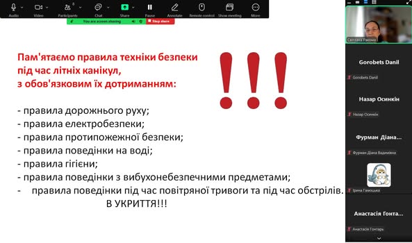 Під час святкового заходу повторили правила безпечної поведінки на літніх канікулах, привітали одне одного з перемогами в конкурсах та переглянули здобуті дипломи, знову занурилися в атмосферу шкільних буднів через перегляд відео з конкурсу-серіалу про наші навчальні дні.