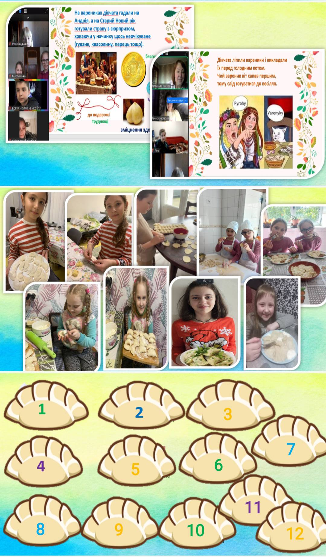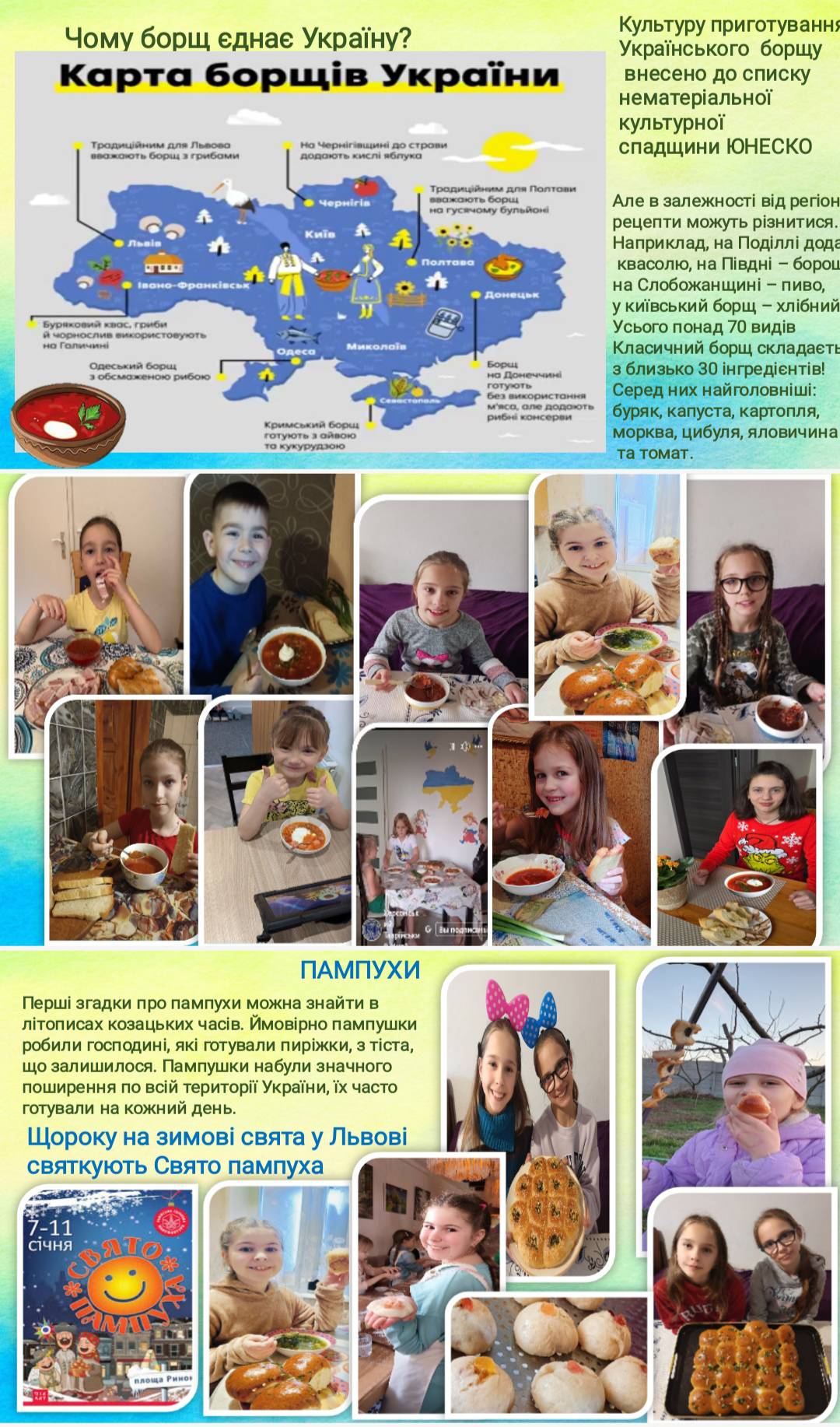Тетяна Миколаївна продемонструвала карту борщів України, показала смачні фото дітей з тарілками борщу, а який борщ без пампухів - тож були й вони, разом із запашним хлібом! Розповіла про козацький куліш, різновиди каш, вареники, і навіть поділилася фото, як діти їх власноруч ліпили вдома.