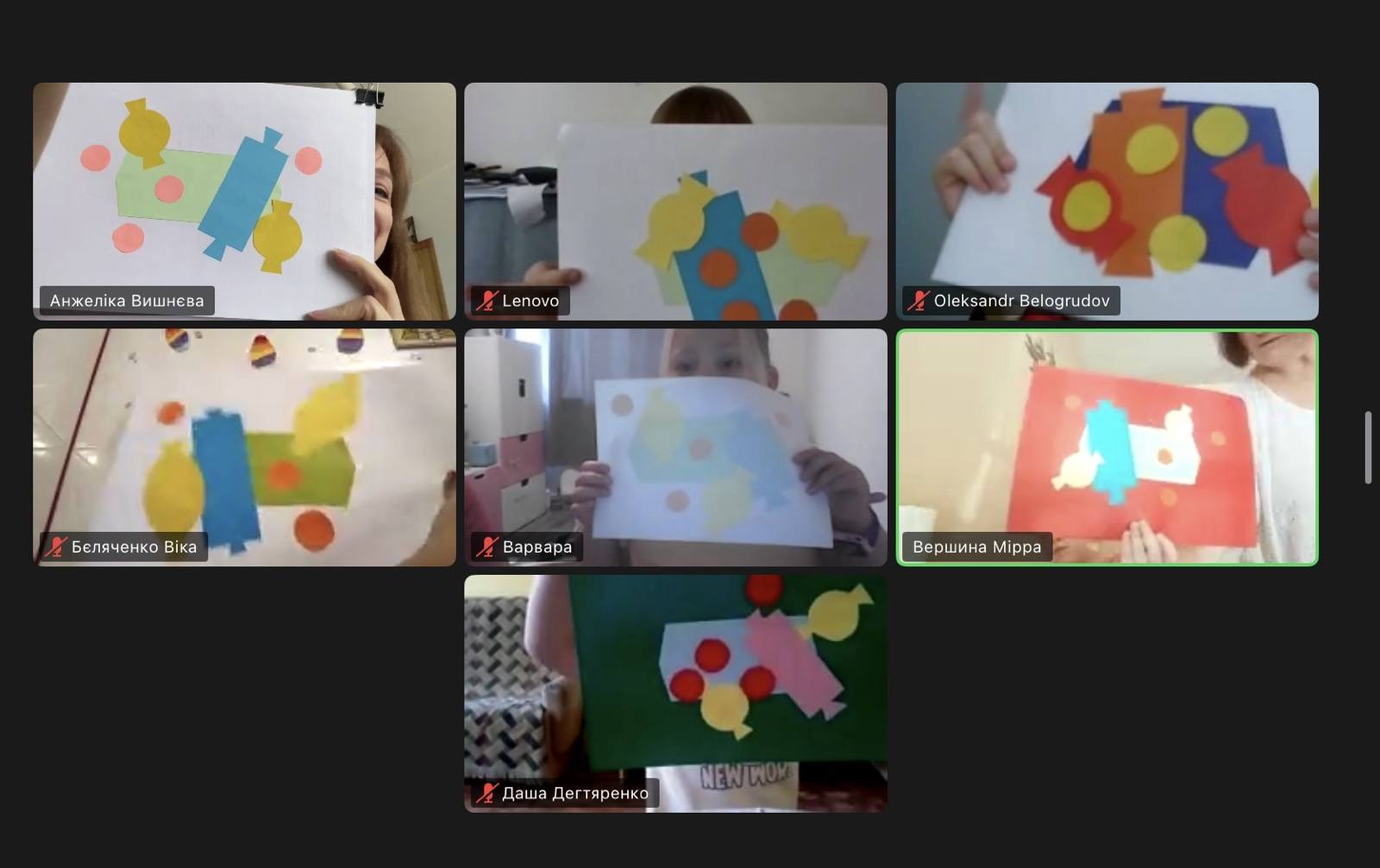 На уроці маленькі учні ознайомилися з поняттям "композиція", а також з правилами розміщення елементів композиції на елементарному рівні. Творчим завданням було правильне композиційне розміщення, вирізаних заздалегідь з кольорового паперу, фігур, схожих на цукерки, на аркуші паперу. Це завдання всі учні чудово і із задоволенням виконали.