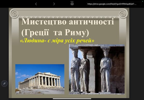 Учні переглянули відео і фото із зображенням мистецьких здобутків періоду Стародавньої Греції. На уроці, також обговорили мистецькі особливості Античності, зосередившись на стильових рисах творів архітектури та скульптури.