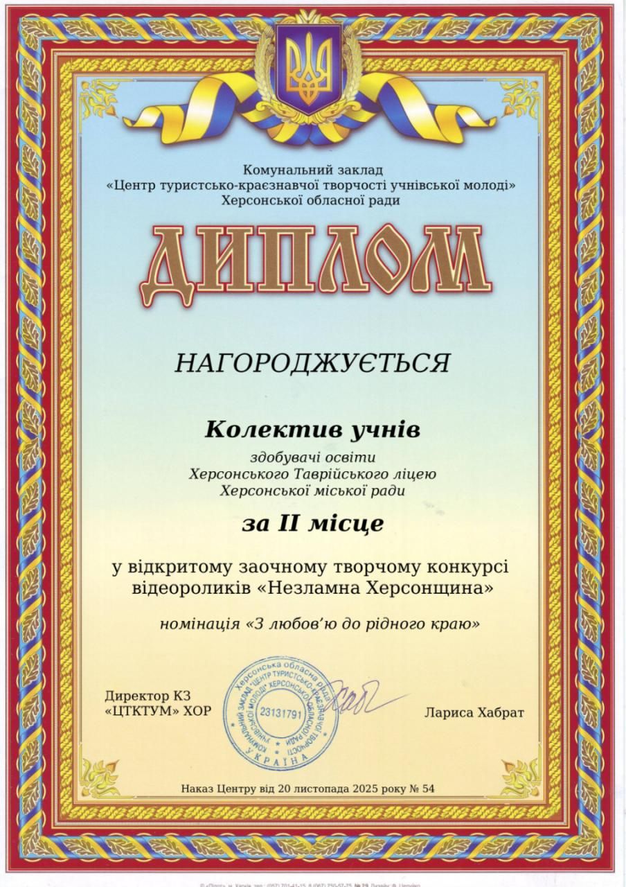 ХЕРСОНСЬКИЙ ТАВРІЙСЬКИЙ ЛІЦЕЙ Херсонської міської ради оголошує набір учнів 1-11 КЛАСІВ на 2025-2026 н.р. Контакти для більш детальної інформації: моб.тел. +380677628709, +380505200530, електронна пошта htl.nabir@gmail.com