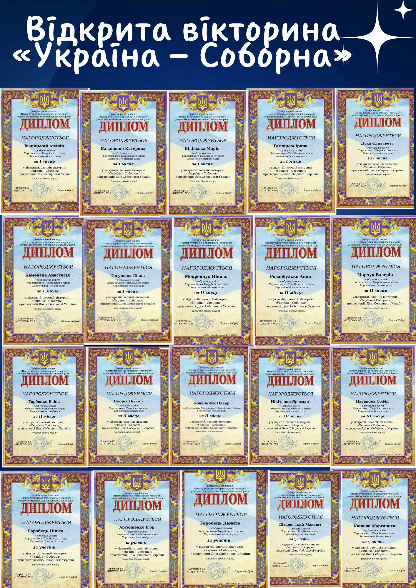 Вітаємо переможців та учасників відкритої заочної вікторини «Україна – Соборна»! Вітаємо переможців та учасників відкритої заочної вікторини «Україна – Соборна»!