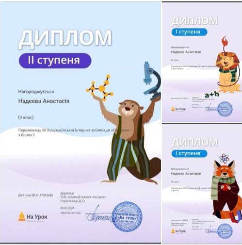 Вітаємо ученицю 9-ХО класу Анастасію НАДЄЄВУ, переможницю трьох Всеукраїнських інтернет-олімпіад від проєкту "На Урок" з математики, фізики та біології. Пишаємось нашими талановитими учнями!!!