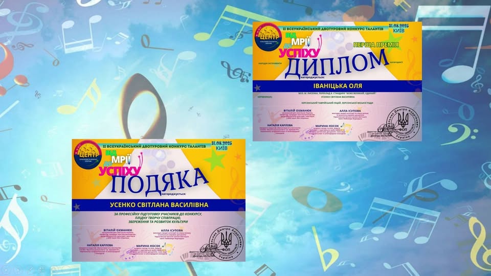 Це високе визнання — результат твого таланту, наполегливої праці та щирої любові до творчості. Твоя перемога — це справжнє натхнення для всіх, хто мріє, працює і не зупиняється на досягнутому.