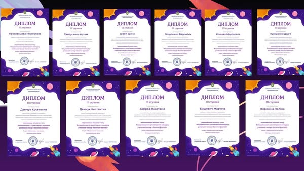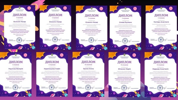 Любі учні, вітаємо вас із заслуженими нагородами у конкурсі малюнків "Космічні фантазії"! Ваші роботи вразили своєю творчістю, оригінальністю та майстерністю. Ви не просто намалювали космос – ви оживили його у своїй уяві, створивши неймовірні світи, мрії та ідеї, що надихають.