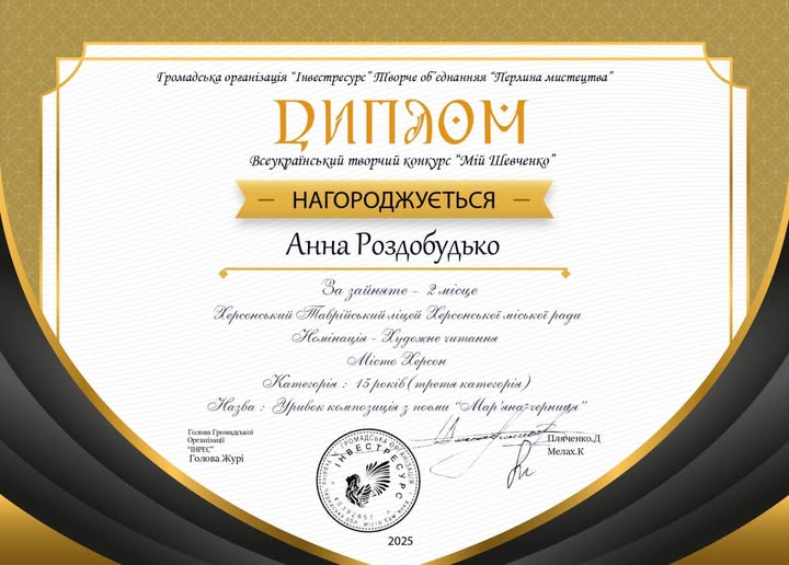 Твій талант, натхнення і щирість у виконанні віршів Великого Кобзаря заслуговують найвищої похвали. Ти не лише продемонструвала майстерність, а й змогла передати глибину і силу його слова, зворушивши серця слухачів.