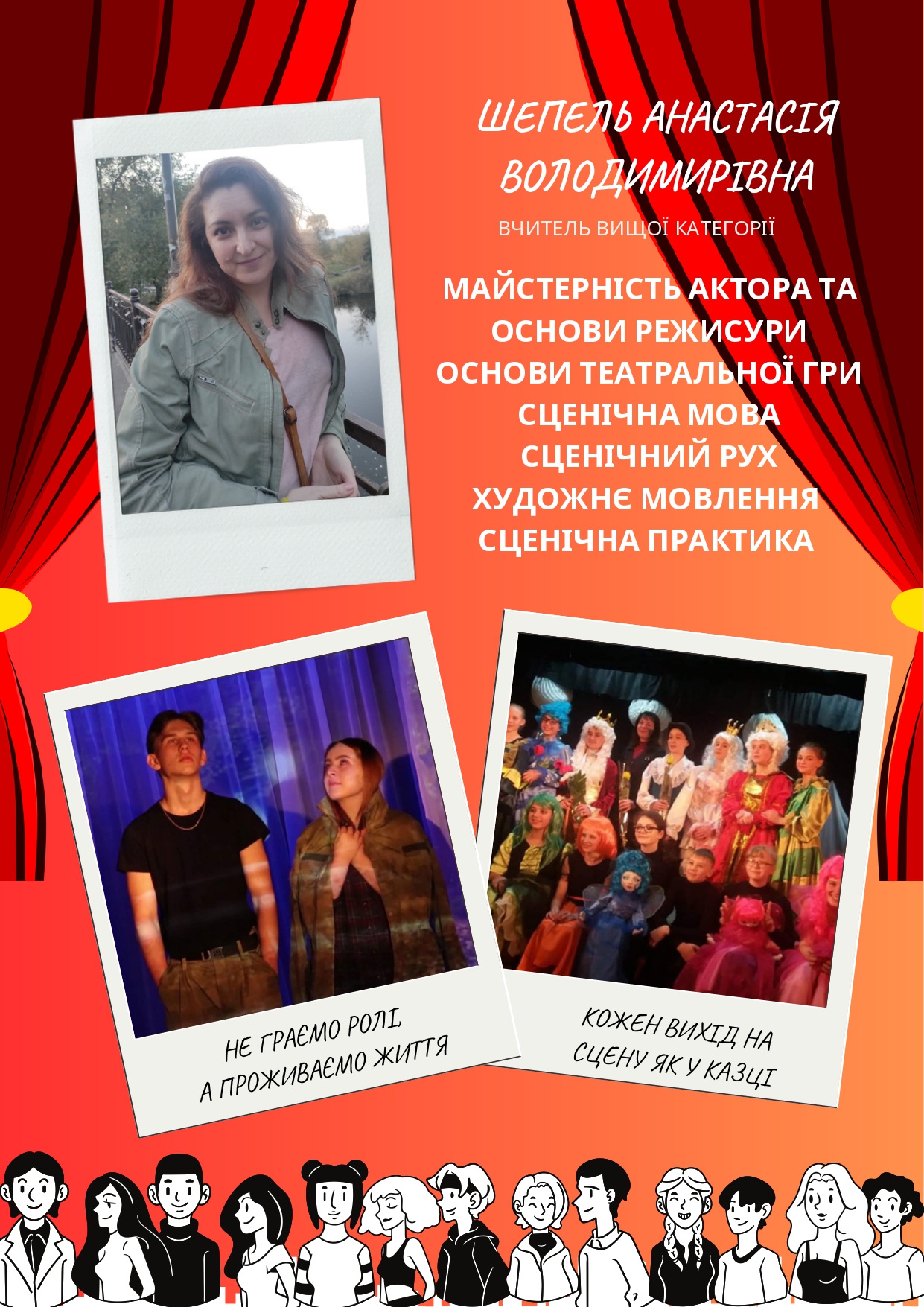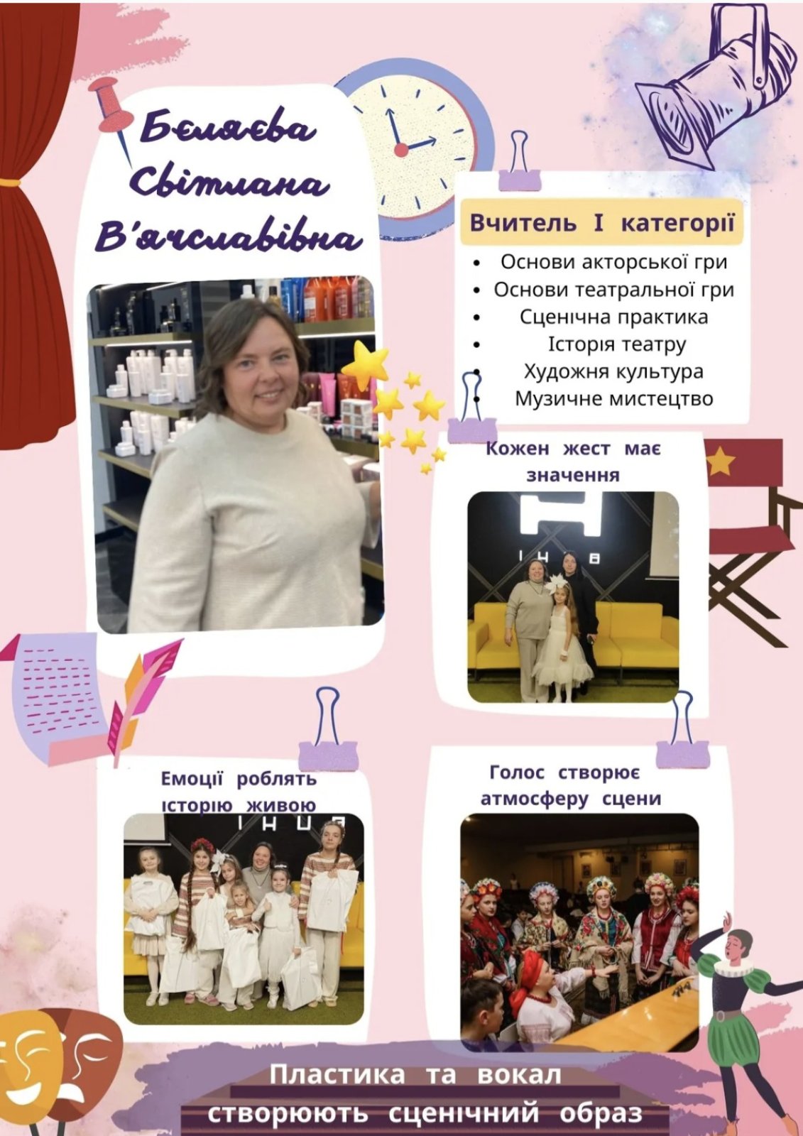 Забезпечує цілісний розвиток особистості учнів через засоби театрального мистецтва, створюючи умови для формування поліхудожніх компетентностей, розвитку аналітичного сприйняття, критичного мислення та творчої самореалізації. Навчання спрямоване на оволодіння навичками інтерпретації й самостійного створення сценічних постановок, розвиток досвіду колективної творчої діяльності, формування естетичних смаків, етичних орієнтирів і культурної свідомості.