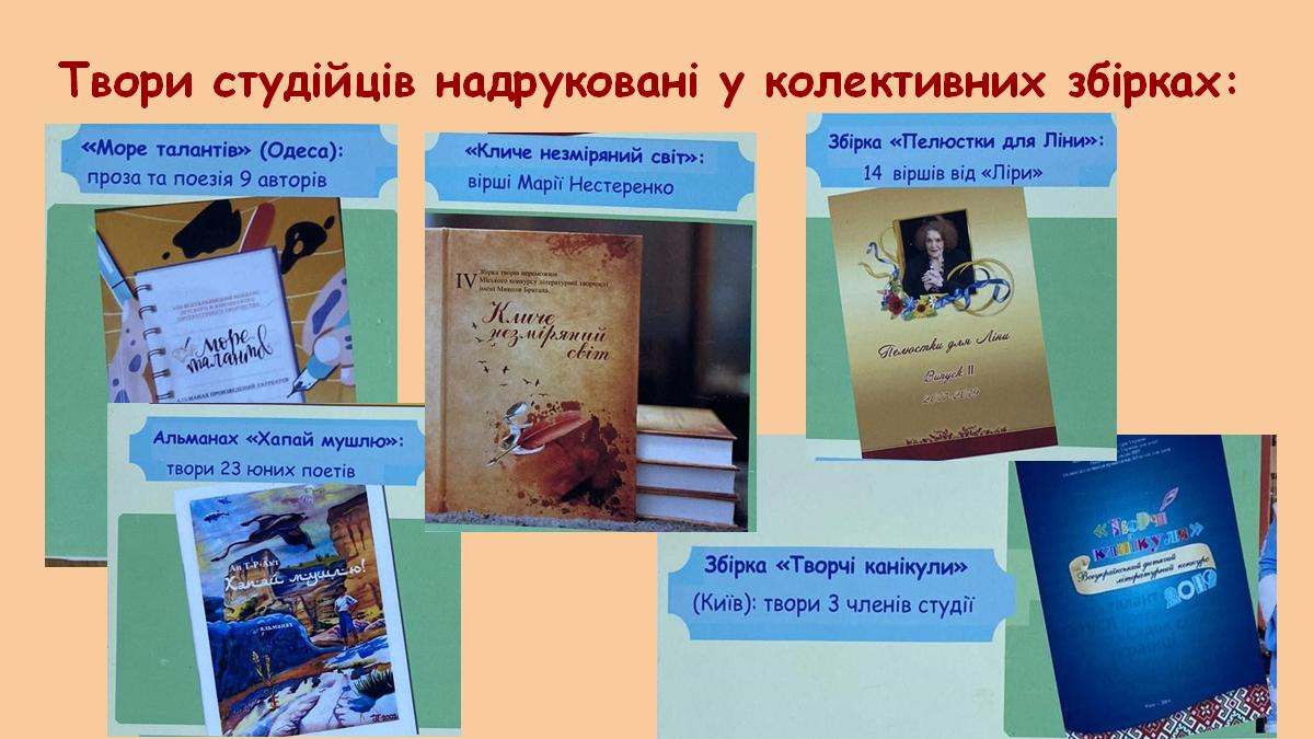 Твори юних авторів регулярно з’являються у виданнях «Чарівні веснянки», «Рядки, які дарують радість», а також у всеукраїнських збірках — «Творчі канікули» (Київ), «Море талантів» (Одеса), «Кличе незміряний світ» (Херсон), «Антракт» тощо.