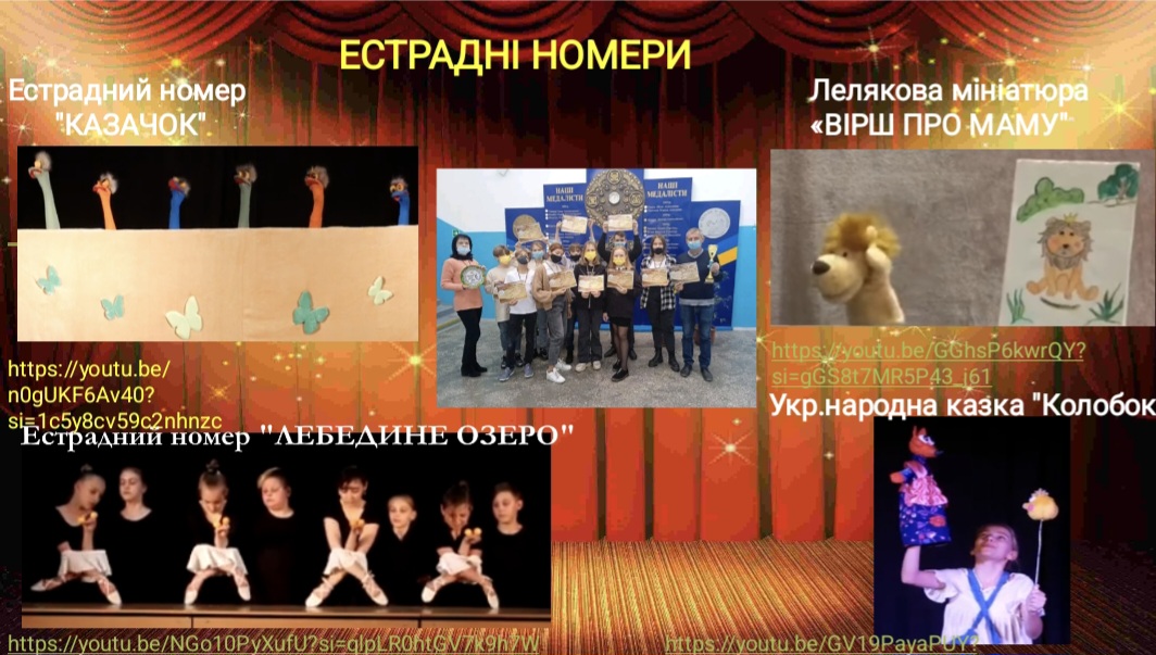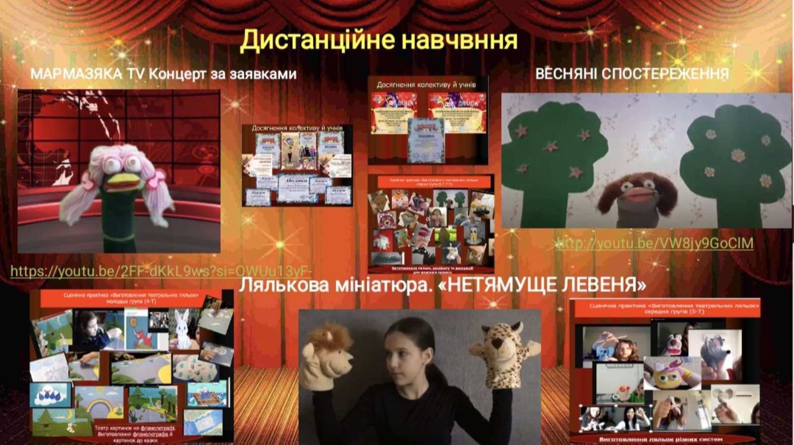Під час дистанційного навчання упроваджено формат малих сценічних форм — етюдів, мініатюр, літературно-музичних композицій. Учні знімають уривки вистав на телефони, а керівники здійснюють монтаж відеоробіт, створюючи спільні творчі відеопроєкти — новітній формат сучасного лялькового мистецтва.